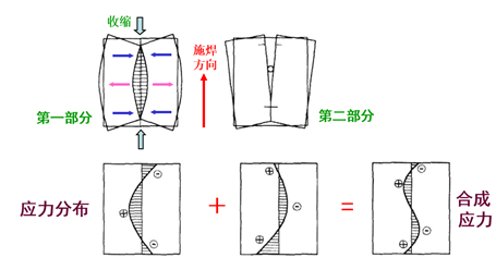 ——A. 焊缝纵向收缩导致两块板反向弯曲--中间横向受拉,两端受压