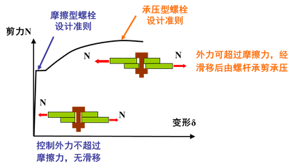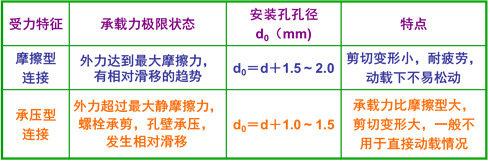 承压型连接以栓杆剪坏或孔壁压坏为极限状态(与普通螺栓相同),孔径较摩擦型偏小,避免出现较大滑移变形。