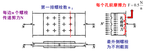 计算假定每个螺栓的有效摩擦面均匀受力,则在验算板件最外排螺栓处的净截面强度时,一部分力在孔前已由有效摩擦面上的摩擦力传给另一个板件,每个高强螺栓孔前传力为50%,即孔前传力系数为0.5。