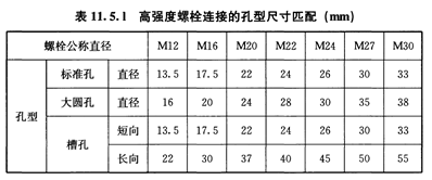 2)高强度螺栓摩擦型连接可采用标准孔、大圆孔和槽孔,孔型尺寸可按表11. 5. 1 采用;采用扩大孔连接时,同一连接面只能在盖板和芯板其中之一的板上采用大圆孔或槽孔,其余仍采用标准孔;