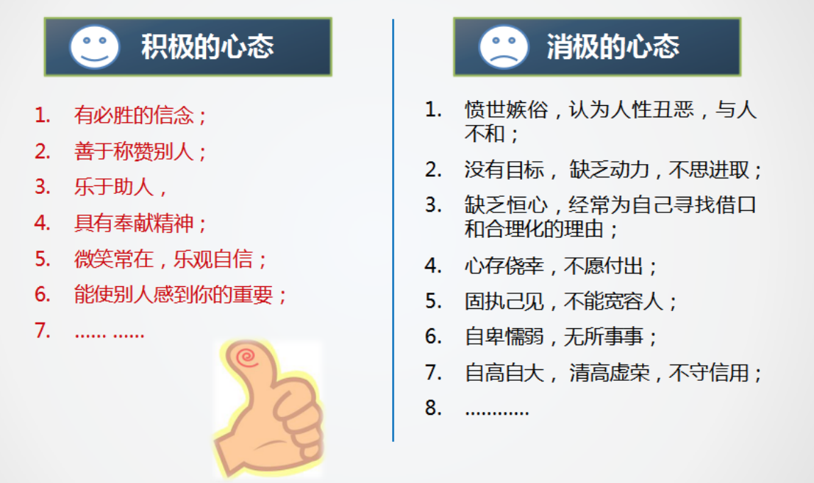 作为一名优秀客服人员,需要拥有积极的心态,俗话说“心态决定一切”,不同的心态决定了不同的结果。