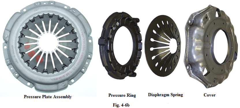 Pressure plate assembly bolted to the flywheel includes a metal cover, a diaphragm spring and a metal pressure ring, which provides a friction surface for the clutch disk (see Fig.4-8).