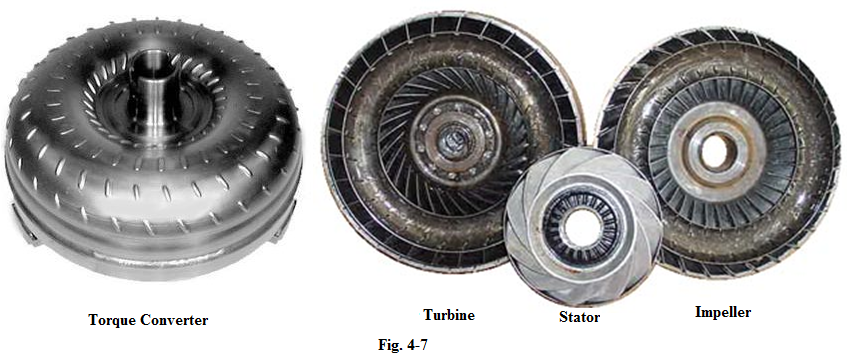AT cars use a torque converter instead of the clutch used on MT cars. The torque converter is mounted between the engine and the transmission and turns as the same speed as the engine.A torque converter has three main parts: impeller, turbine and stator that work together to transmit power from the engine to the transmission (see Fig.4-9) . It uses hydraulic pressure to control the amount of engine power transmitted to the transmission input shaft.