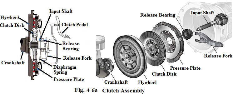 Clutch is used to engage with the engine to transmit the power to the transmission, or disengage with the engine in order to shift gears. It is located between the engine and the transmission. Basically, clutch assembly consists of following main parts: flywheel, clutch disk, pressure plate assembly, release bearing, release fork, clutch pedal and linkage as shown in Fig.4-7.