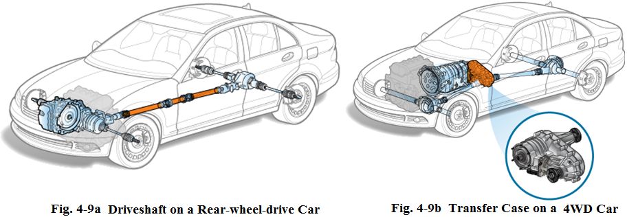 On a rear-wheel-drive car, a drive shaft is used to transmit the power from the transmission to the differential between the two rear drive wheels (see Fig.4-12). Many 4WD cars use two drive shafts, with one drive shaft between the transfer case and rear drive axle and the other one between the transfer case and front drive axle (see Fig.4-13). The transfer case is only used to control the power to the front and rear drive axles.