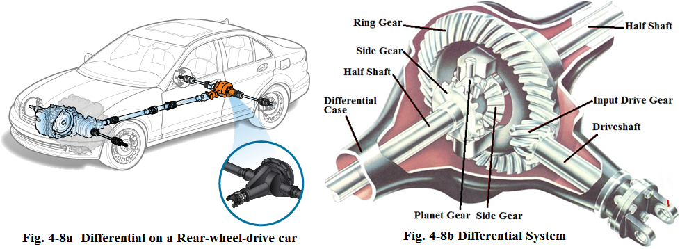 The functions of differential system are to send power to two drive wheels and to help the car change moving direction while the car is going around the corner. On a front-wheel-drive car, the differential and the transmission combine together within one housing, called “transaxle” . On a rear-wheel-drive car or on a four-wheel-drive (4WD) car, the differential is connected to the drive shaft (see Fig.4-10).