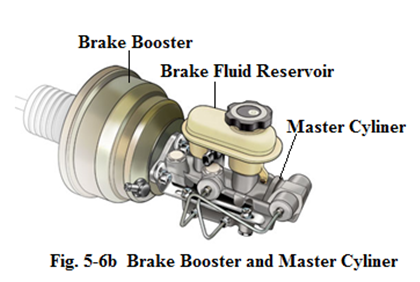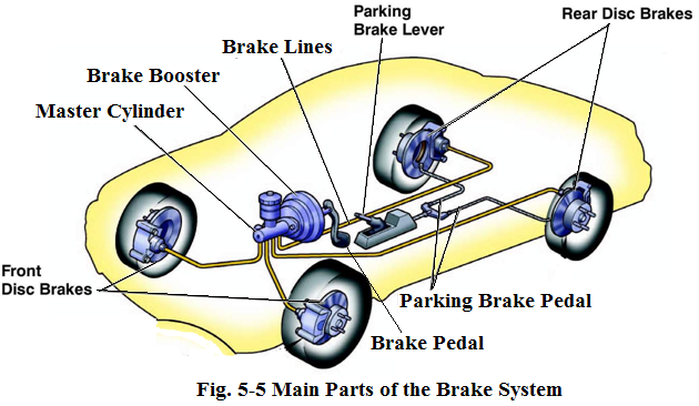 Typical braking system has the following basic parts: brake pedal, brake booster, master cylinder, brake lines and brake fluidas shown in Fig.5-8.