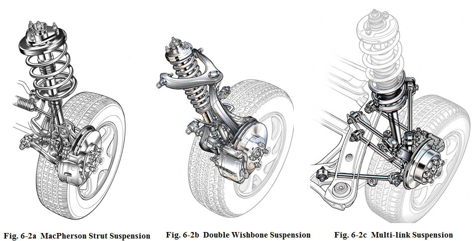 Double wishbones suspension also known as an A-arm suspension (see Fig.6-5), which is another common front independent suspension. It uses a shorter upper control arm and a longer lower control arm that hold the wheel to the frame. The advantages of this type suspension are always to keep the wheel moving up and down perpendicularly to the road surface and to ensure good handling.