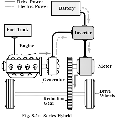 In a series hybrid car, the engine and the electric motor are connected together in a series. It works in the following manner: the engine converts the fuel from the fuel tank into the mechanical energy to drive the generator, generating electric power. Then the generator delivers the electric power through the inverter to the electric motor which moves the car. There is no mechanical connection between the engine and the drive wheels, so the engine never directly drives cars (see Fig.8-1).