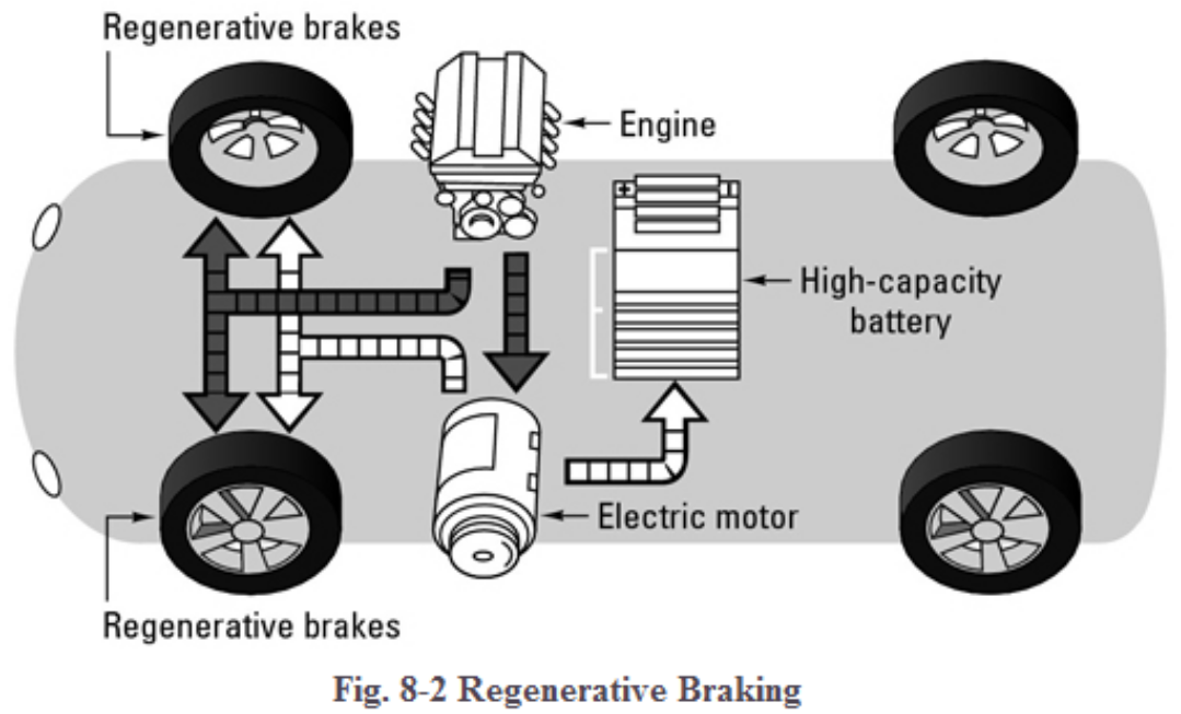 The three types of HEV above all include the regenerative braking feature. The regenerative braking is an energy recovery mechanism which converts wasted energy from braking into electricity and stores it in the battery. In the regenerative braking, the electric motor reverses direction so that the rotating car wheels can turn it, producing electricity to store in the battery just like a generator (see Fig.8-4).