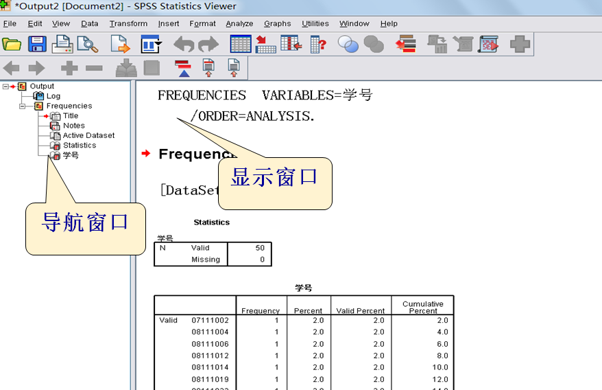 在 SPSS中大多数统计分析结果都将以表和图的形式在结果观察窗口中显示。窗口右边部分显示统计分析结果,左边是导航窗口,用来显示输出结果的目录,可以通过单击目录来展开右边窗口中的统计分析结果。当用户对数据进行某项统计分析,结果输出窗口将被自动调出。当然,用户也可以通过双击后缀名为.spo的 SPSS 输出结果文件来打开该窗口。