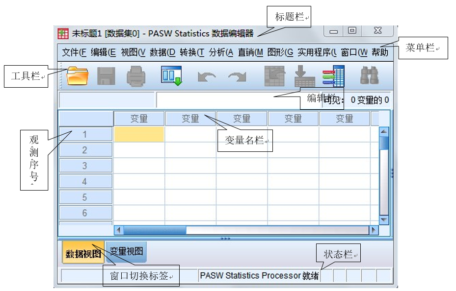 启动 SPSS后看到的第一个窗口便是数据编辑窗口,如图 1.3所示。在数据编辑窗口中可以进行数据的录入、编辑以及变量属性的定义和编辑,是SPSS 的基本界面。主要由以下几部分构成:标题栏、菜单栏、工具栏、编辑栏、变量名栏、观测序号、窗口切换标签、状态栏。