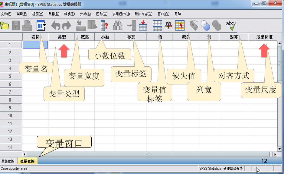 ♦窗口切换标签:用于“数据视图”和“变量视图”的切换。即数据浏览窗口与变量浏览窗口。数据浏览窗口用于样本数据的查看、录入和修改。变量浏览窗口用于变量属性定义的输入和修改。