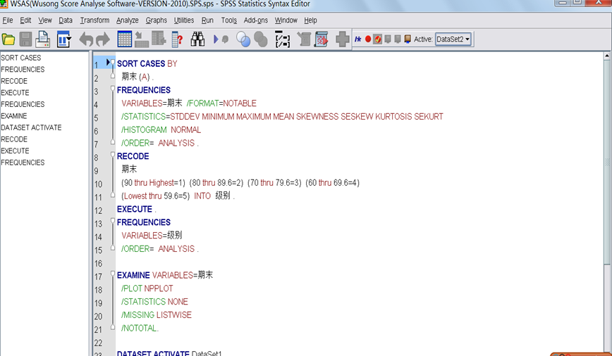 • 选择菜单栏中的【File (文件)】→【Ne w(新建)】→【Sy nt a x(语法)】命令,新建一个SPSS的语句文 件,如下图所示。