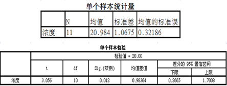 结果显示统计量t=3.056,P值=0.012<0.05,因此认为用该方法测量所得结果与标准浓度值有差异。