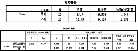 结果显示Levene检验显著性P值为0.397>0.05,故方差齐。不同组间独立样本T检验统计量t=3.056,P值为0.004<0.01,因此认为两位老师分别任教的甲、乙两班考试后的成绩存在极显著差异,即两位老师的教学质量存在极显著差异。