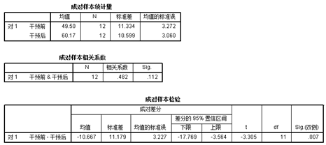 结果显示统计量t=-3.305,P值=0.007<0.01,因此认为干预前后该地区贫血儿童血红蛋白(%)平均水平有变化,结合本案,可以认为该种干预措施可以增加该地区贫血儿童血红蛋白(%)平均水平。