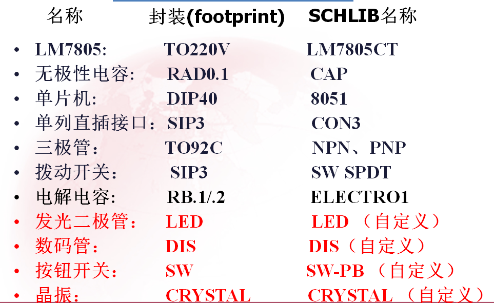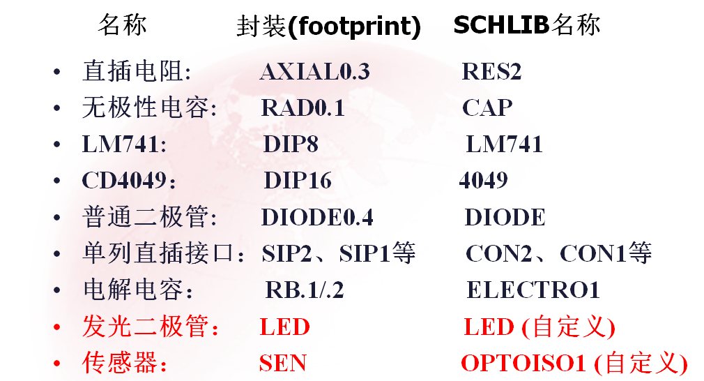 (1)常用的直插式电子器件包括色环电阻、引脚电容、二极管、三极管等。一般存放在 Miscellaneous Devices.SCHLIB这个元件库中。常用分立元件的封装如下图所示: