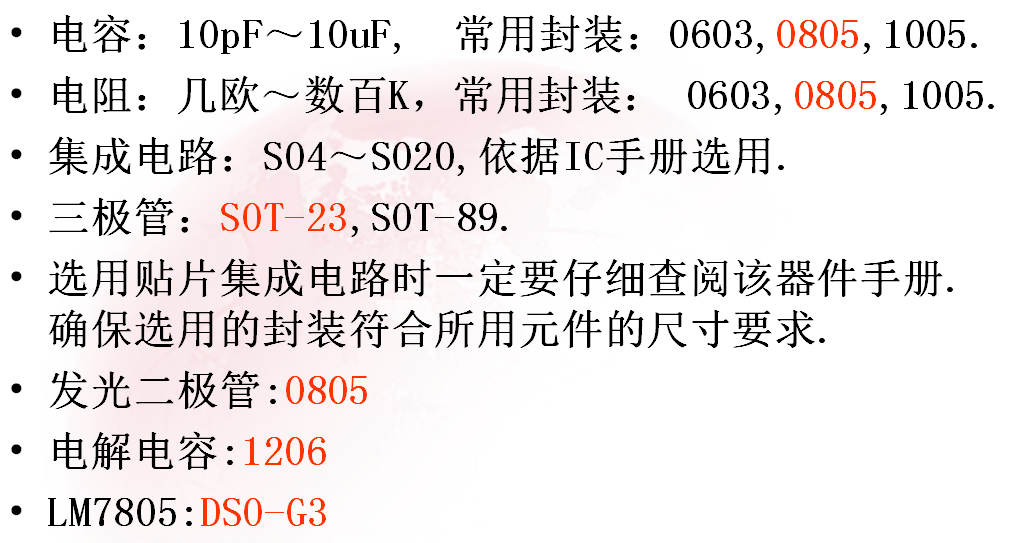 (2)常用贴片原件的封装如下图所示: