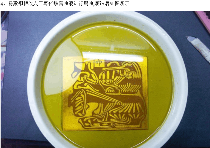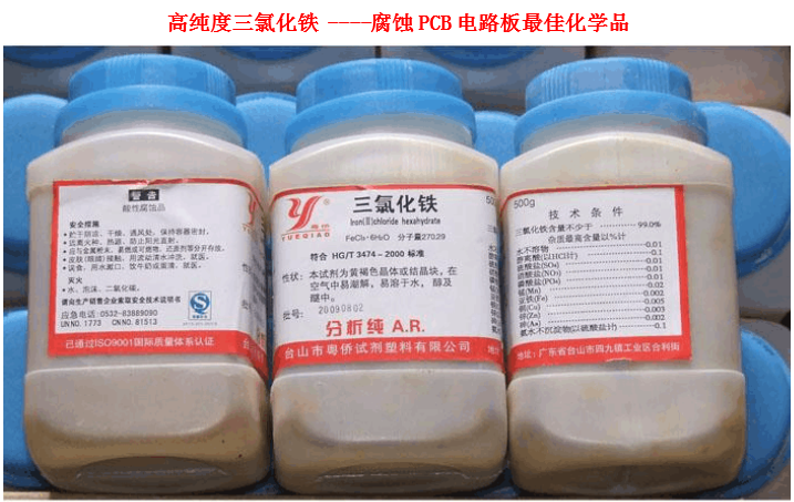 腐蚀液一般用三氯化铁加水配置而成。三氯化铁容易吸收空气中水分所以要密封保存。三氯化铁与水的调节比例为1:4(即500克三氯化铁配2000cc的水)。用热水可以加快蚀刻的速度。三氯化铁具有一定的腐蚀性所以最好不要弄到皮肤上或者衣服上。腐蚀好的铜板一般用松香溶液涂擦一遍,可以助焊也可以防止氧化。