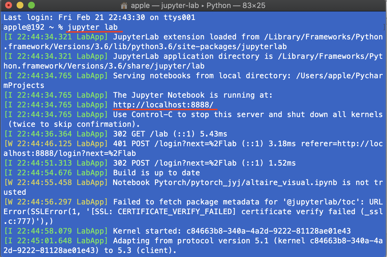 全部模块包安装完毕后,通过命令行启动可视化开发环境 输入命令jupyter lab