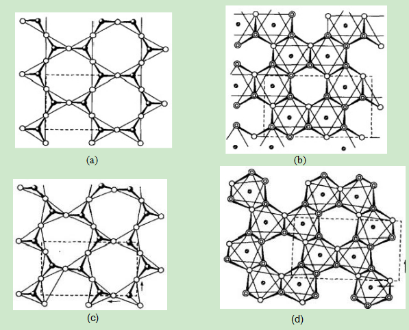 (a) 和 (b) 是理想的情况; (c) 和 (d) 是在高岭土和地开石中发现的畸变了的排列