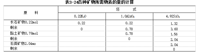 满足上式所需的黏土、长石、石英矿物数量的计算见表3-24。