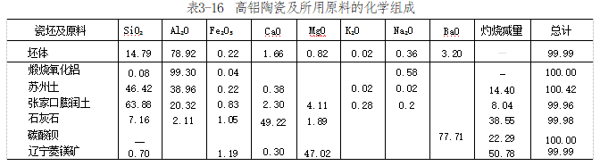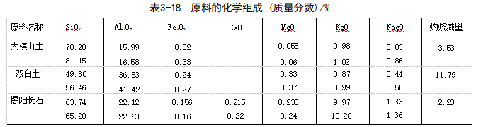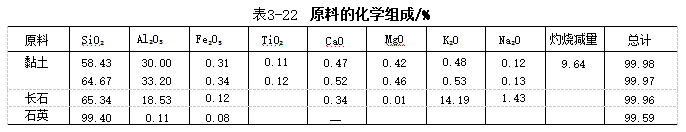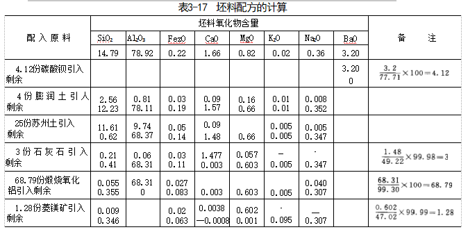 ③坯料中的 Al₂O₃ 主要由煅烧氧化铝来满足。具体计算按表3-17进行。
