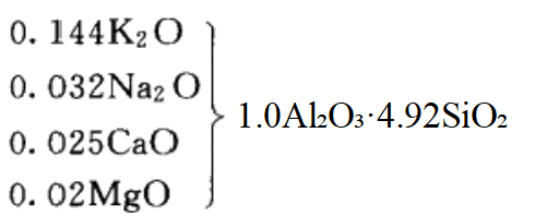 (2)由坯式计算长石、黏土、石英矿物的百分组成。坯式中的 K₂O 、Na₂O 、CaO、 MgO 均粗略归并为K₂O, 则坯式可写成:0.22R₂O·1.0Al₂O₃·4.92SiO₂。
