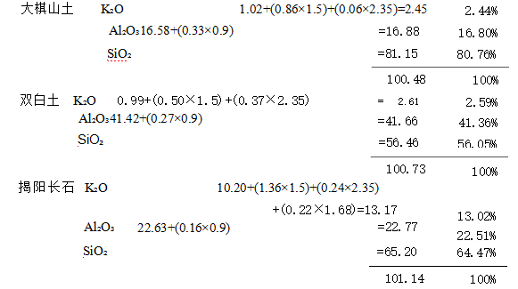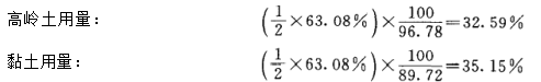 坯料的黏土矿物由高岭土及黏土两种原料供给。计算前应将两种原料的用量确定。考虑 这两种黏土原料的可塑性、收缩率、烧后颜色等各项工艺性能,初步确定坯料中的黏土矿物 的一半由高岭土供给,而另一半由黏土供给。这样便可计算出:
