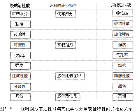 制定坯料配方的基本原则是:所设计的坯料组成及其相应的工艺性能必须满足烧成前后对坯料的各项技术要求。坯体烧成前后的性能与坯料配方特性之间的关系较为复杂(见图3-9)。设计配方的过程,实际上是通过调整各种原料的加入量和相应的加工条件,使上述各种相互关系得以协调的过程。