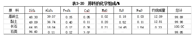 【例3-7】 试用化学组成为表3- 20所示的原料,配成含黏土矿物63 . 08%、长石矿物 28 . 62%、石英矿物8 . 30%的坯料。