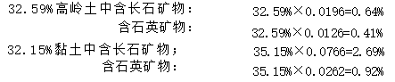 综合起来,高岭土与黏土共引入石英:0 . 41%+0 . 92%=1 . 33%。除去1 . 33%外,坯