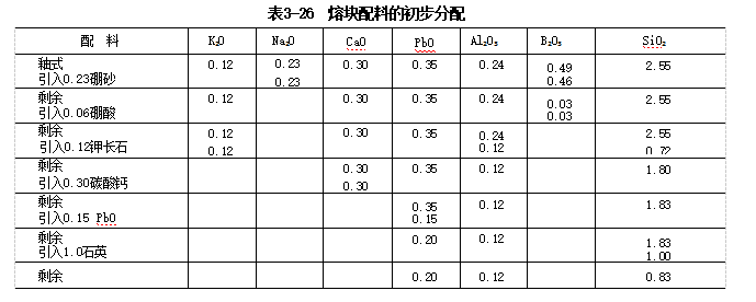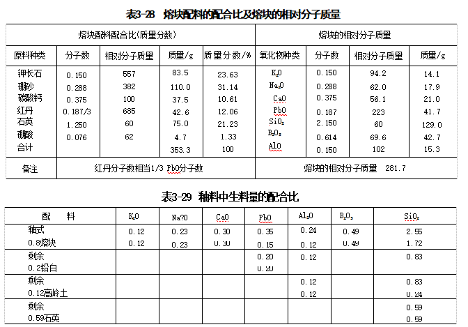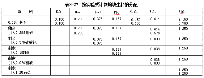 根据各氧化物的分子数、相对分子质量和使用原料,计算熔块配料的配合比和熔块分子比。计算结果见表3-27至表3-29。