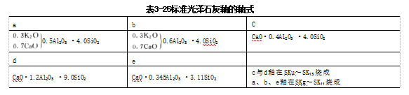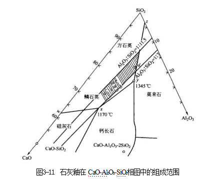 以上组成点仅供参考。在将实用釉转换为相应的CaO-Al₂O₃-SiO₂或K₂O-Al₂O₃-SiO₂三元系统时,采用Richters的近似原则,即各氧化物的质量分数分别乘以转换系数,然后在相图中找到相应位置。