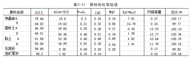 现改用伟晶岩B、高岭土B、黏土B及高岭土选矿的尾砂作原料进行配料。新旧原料的化学组成见表3-31。