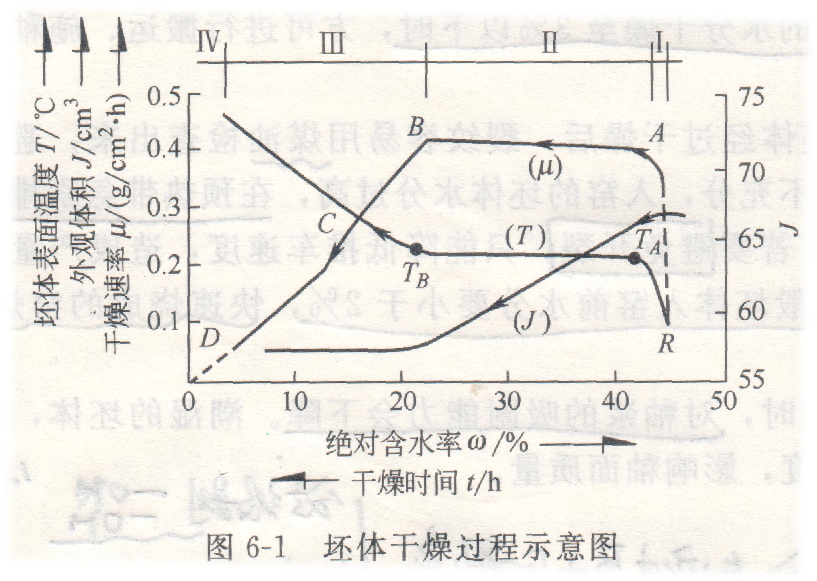 (3)降速干燥阶段:自由水大部分排除时,干燥速度开始下降。从等速干燥阶段过渡的含水量称为临界含水量。到达临界含水量以后,坯体的干燥是排除毛细管中的水和含水矿物中的物理吸附水,坯体略有收缩,因此此阶段坯体内不会产生干燥收缩应力,干燥进入安全状态。