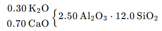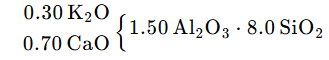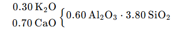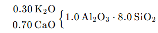 为了获得性能良好的坯、釉配方,有时需要通过调整三个组分来寻找最佳配方,这种方法又称作三角配料法。例如,对于成熟温度为1250℃的基本釉式如下: