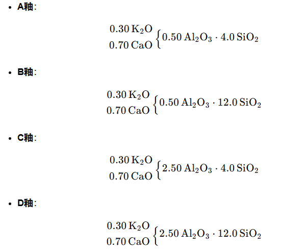 假设Al₂O₃及SiO₂的变动范围分别为1.0和4.0,则可得到高铝、低铝、高硅和低硅4个基础釉,其釉式分别如下: