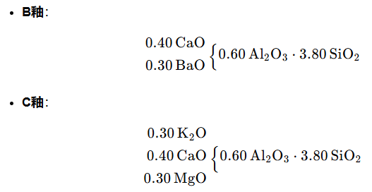 为了提高釉层品质,分别以BaO和MgO取代0.3 mol的CaO,可得到以下两个釉料: