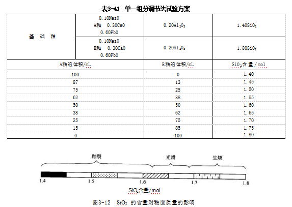 该方法通过改变坯体或釉料配方中两个组分的含量进行调试。具体操作时,首先根据经验或相关资料,确定一个基本坯(釉)式,然后再进行调整。例如,欲配制烧成温度为1390℃的瓷釉,可通过变动釉式中Al₂O₃及SiO₂二组分的含量来寻找最佳配方。首先根据经验拟定基本釉式如下: