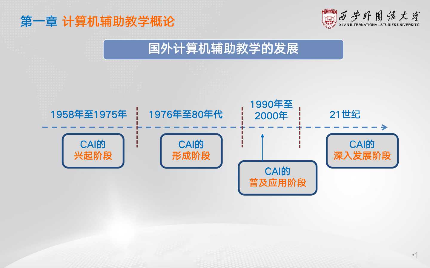 上节课我们学习了计算机辅助教学产生和发展的基础,今天我们将要学习CAI的发展概况,将分别从不同时期开发CAI时所使用的信息技术和所体现出的学习理论来梳理不同时期的发展状况。