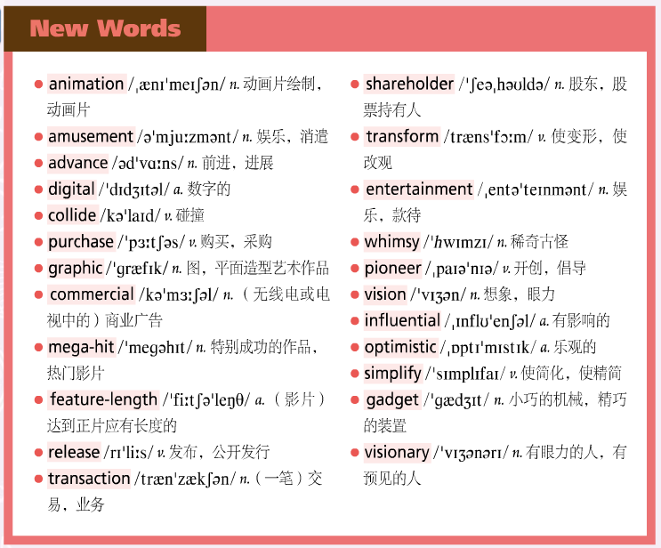 第一次课学习任务:单元主题导入;单元 Warm-up Activities学习和Unit 5 Text A Walt Disney and Steve Jobs' Connection 课文预读和重点词汇学习; 学习课文第一段。