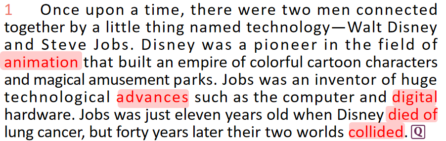1、Once upon a time, there were two men connected together by a little thing named technology—Walt Disney and Steve Jobs. Disney was a pioneer in the field of animation that built an empire of colorful cartoon characters and magical amusement parks. Jobs was an inventor of huge technological advances such as the computer and digital hardware. Jobs was just eleven years old when Disney died of lung cancer, but forty years later their two worlds collided.