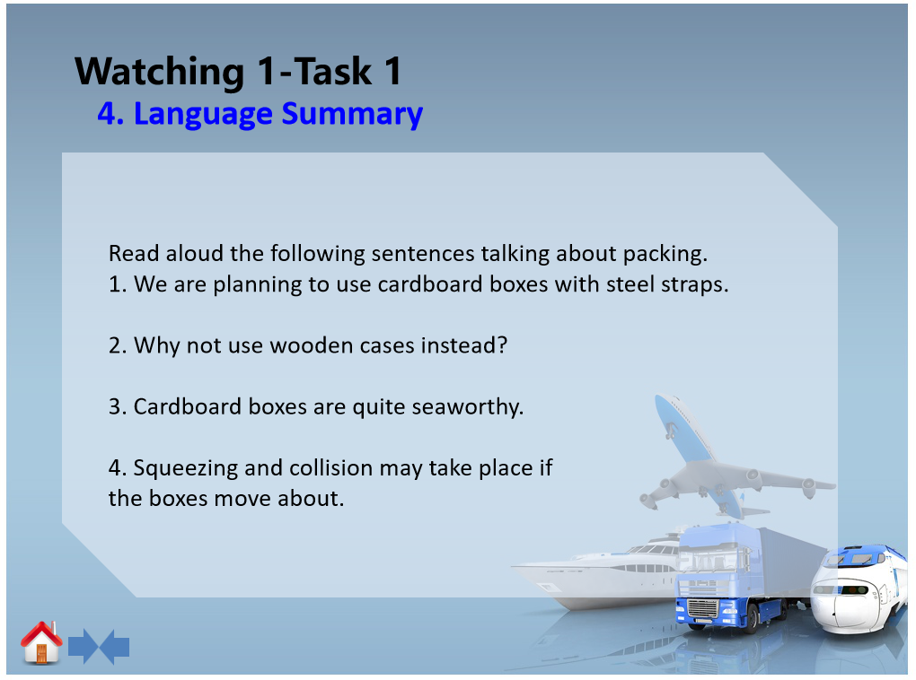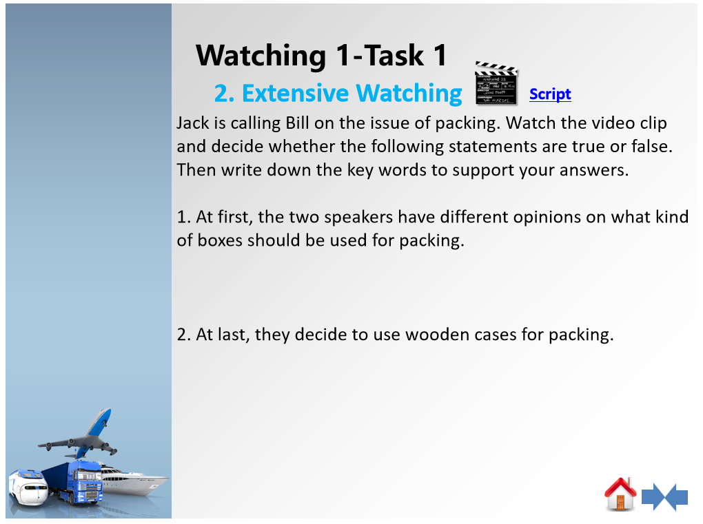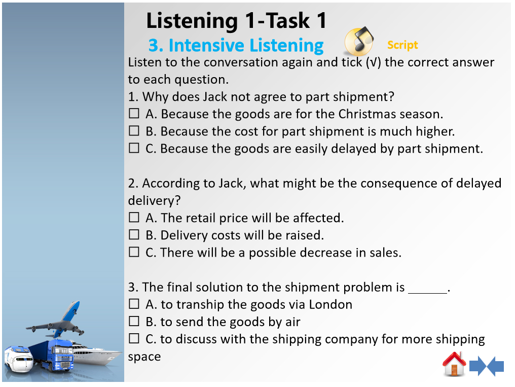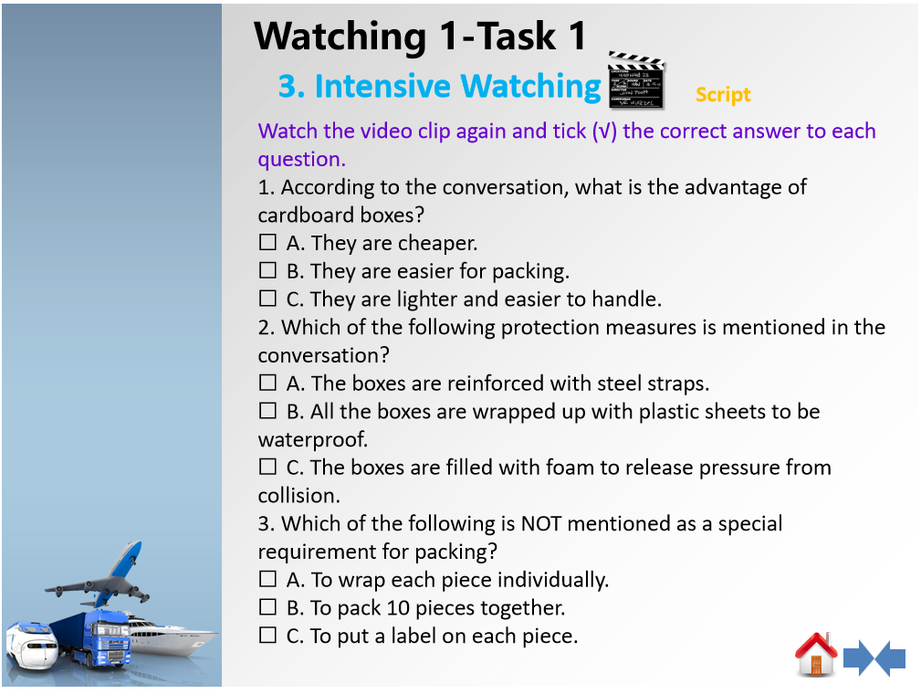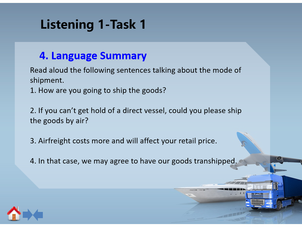 1、第一部分:导入--Listen to the basic expressions about shipment,下附视频文稿帮助理解。