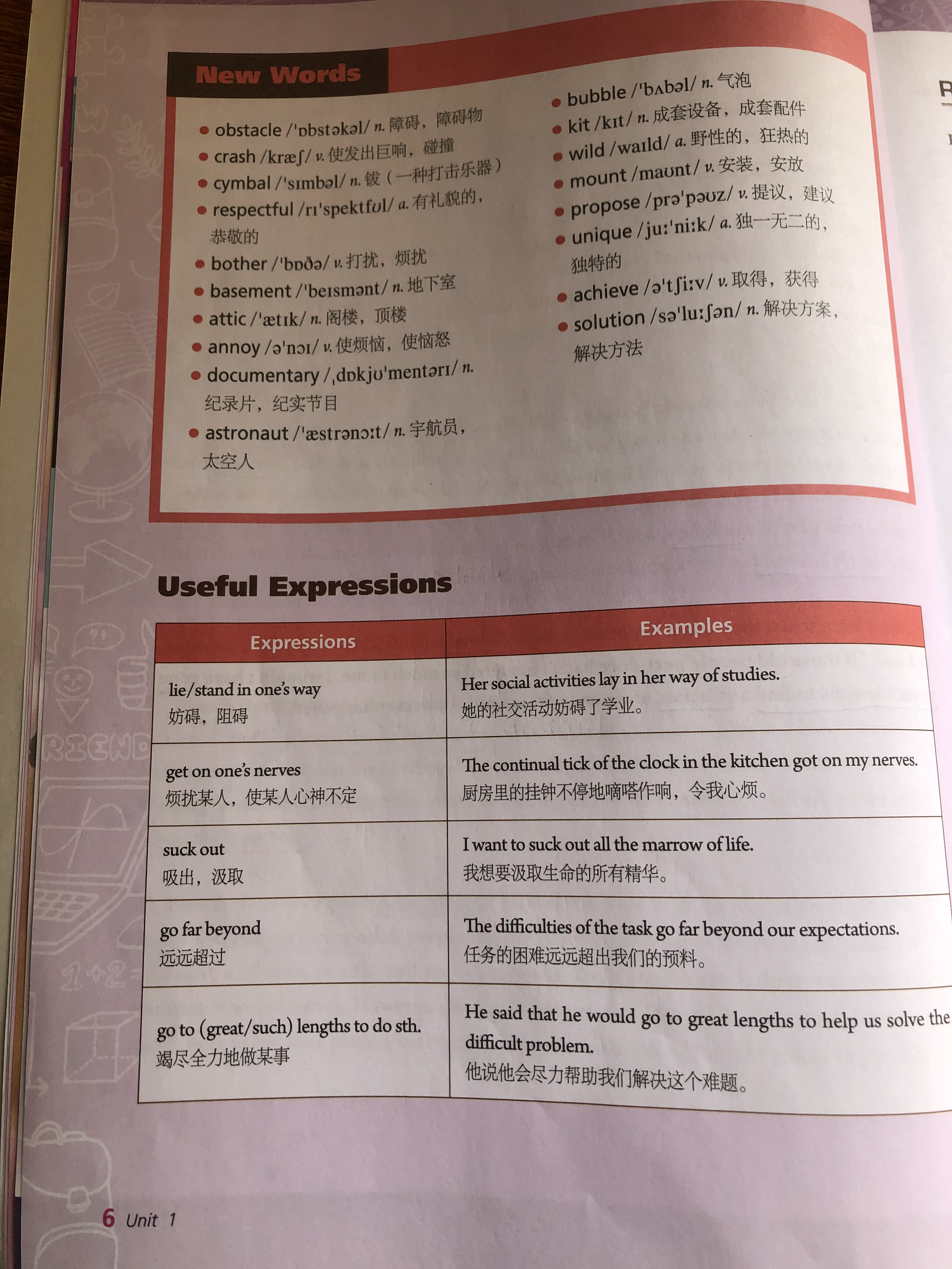 第一次课学习任务:单元主题导入;单元Page 3 Warm-up Activities学习和Unit 1Text A Drums in Space课文预读和重点词汇学习; 学习课文第一段。