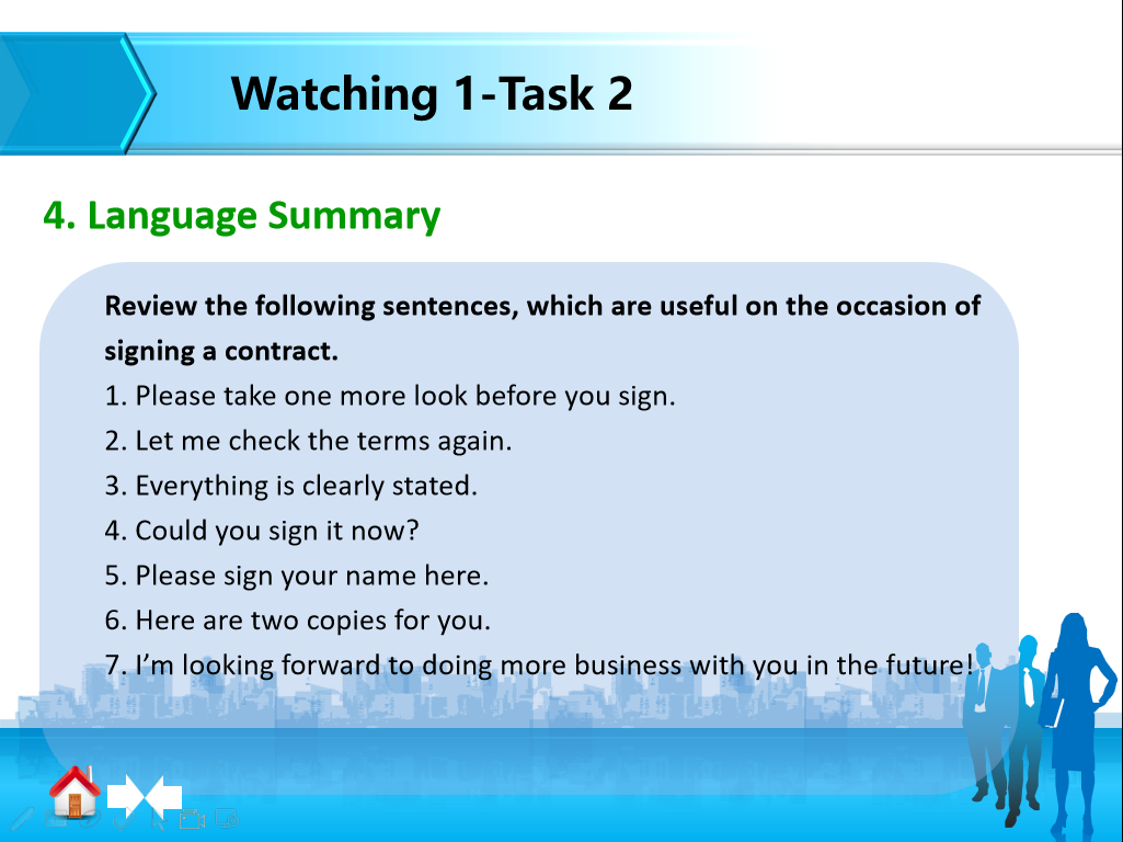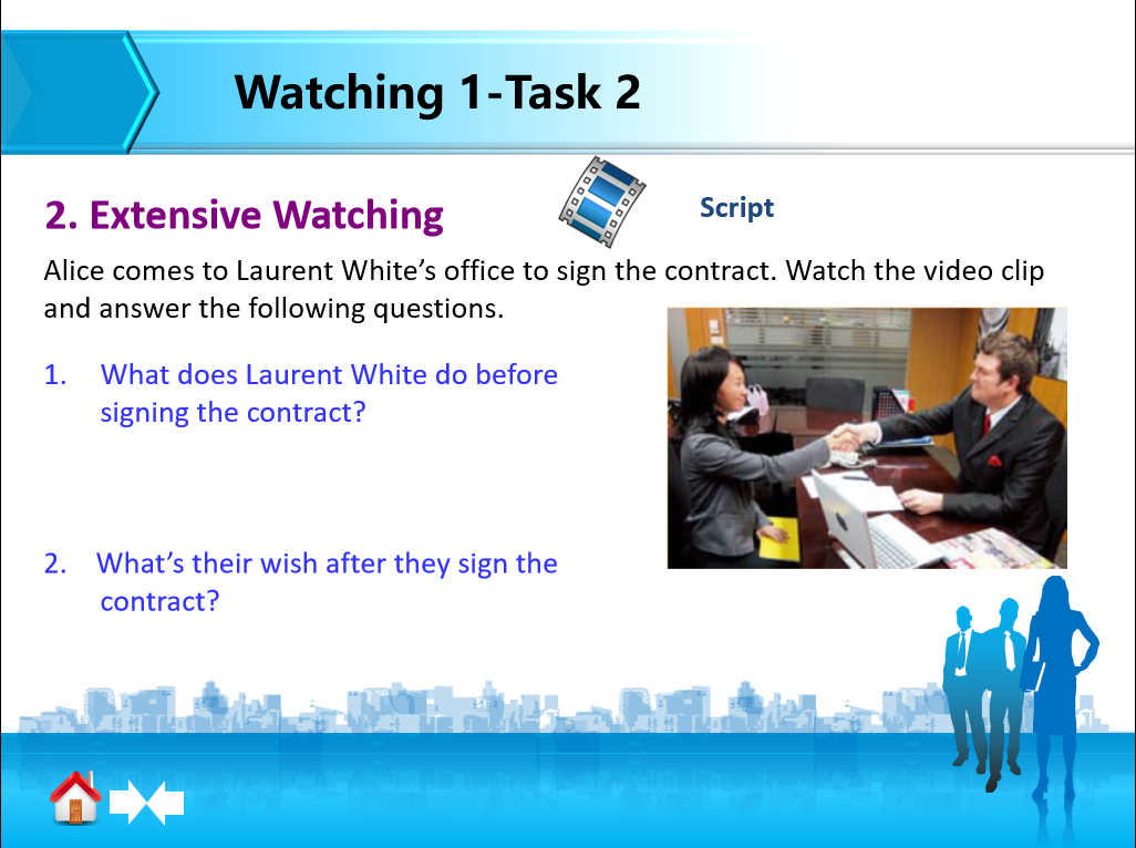 第二次课学习任务:观看视频、自主完成 Watching 1 Task2 & Speaking part的练习;