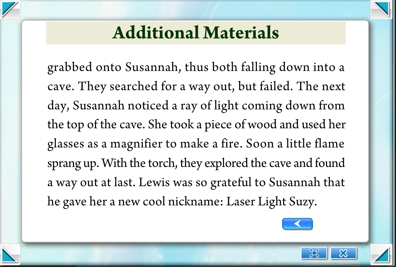 9 Lewis came forward and said: “What a stroke of luck I had! I could not have been with a better fellow adventurer than Laser Light Suzy!”