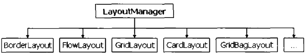 使用布局管理器可以使容器中的组件按照指定的位置进行摆放,即使容器改变了大小布局管理器也可以准确地将组件放到指定的位置,这样做可以有效保证平台无关性。在AWT中所有的布局管理器都是LayoutManager接口的实现者,关系如图所示: