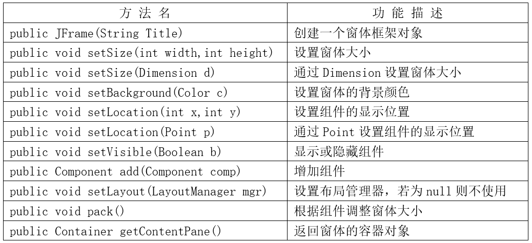 如果要创建GUI应用程序,则直接使用JFrame类即可,此类是Component的子类,它常用的方法如表所示: